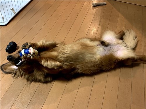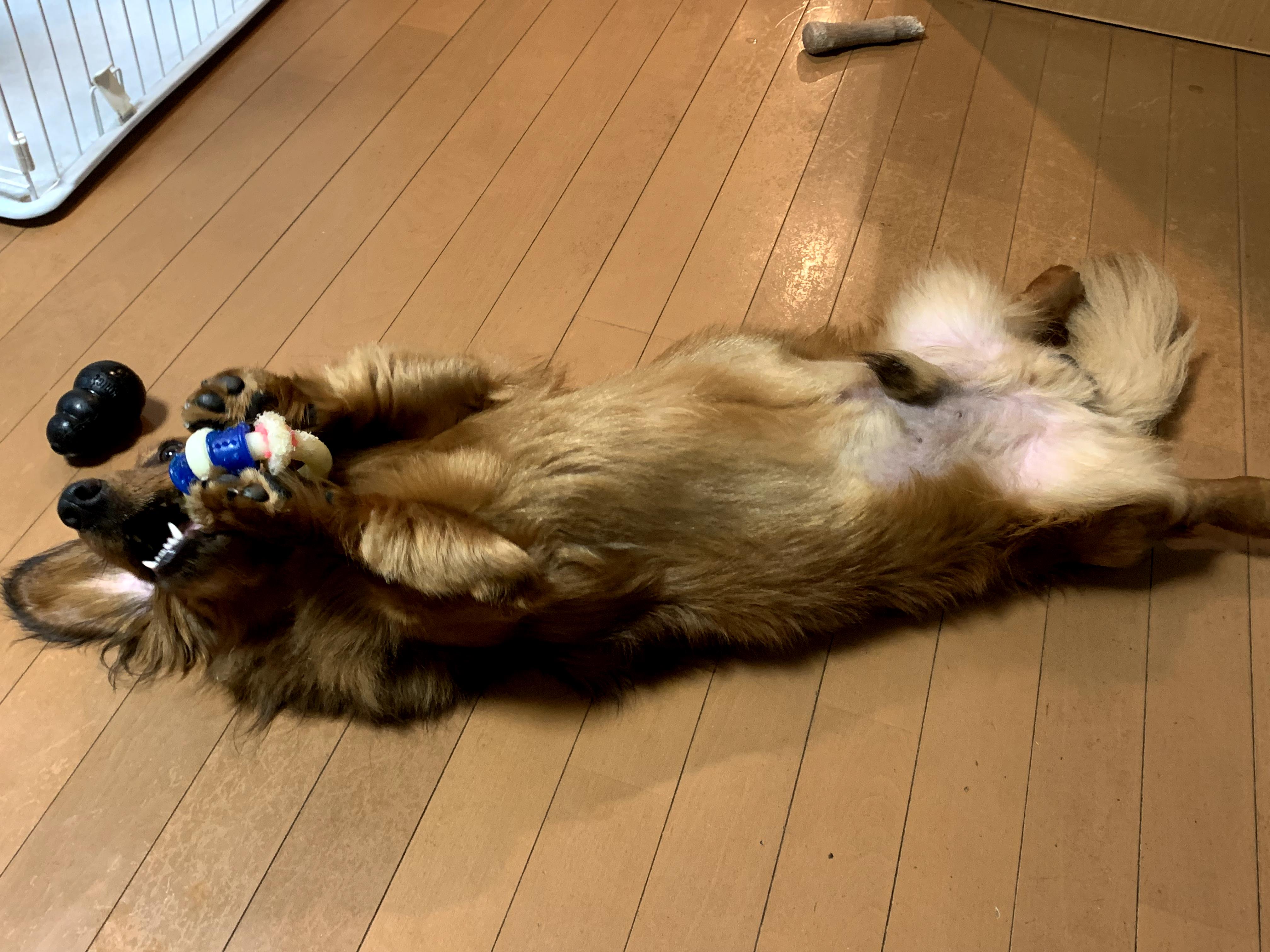 ゴロゴロしながらおもちゃをカミカミ。