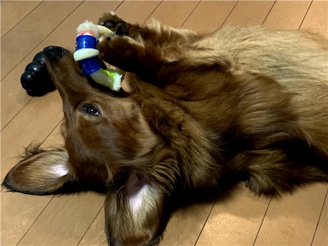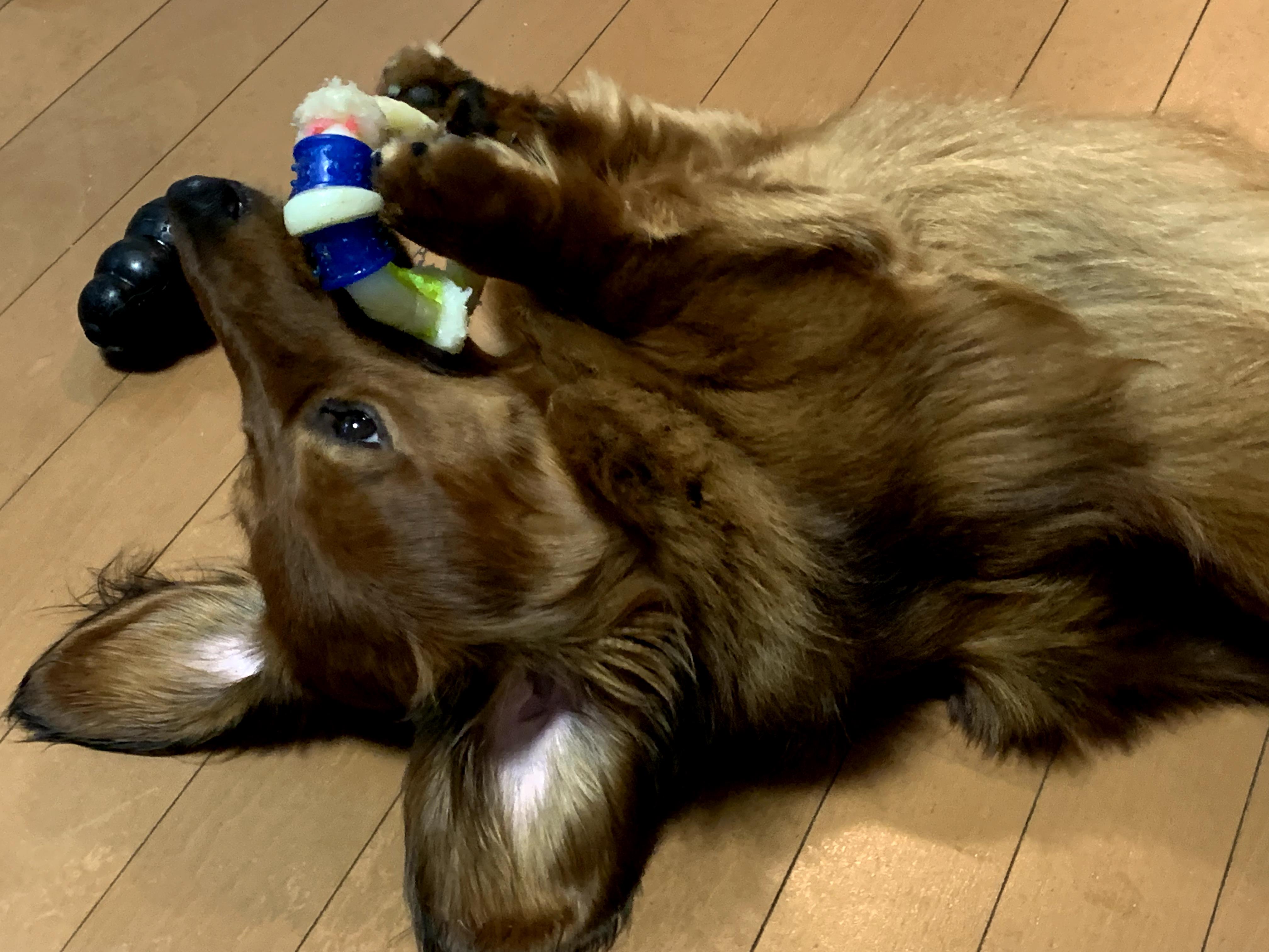 ゴロゴロしながらおもちゃをカミカミ。
