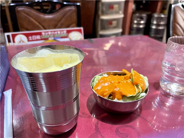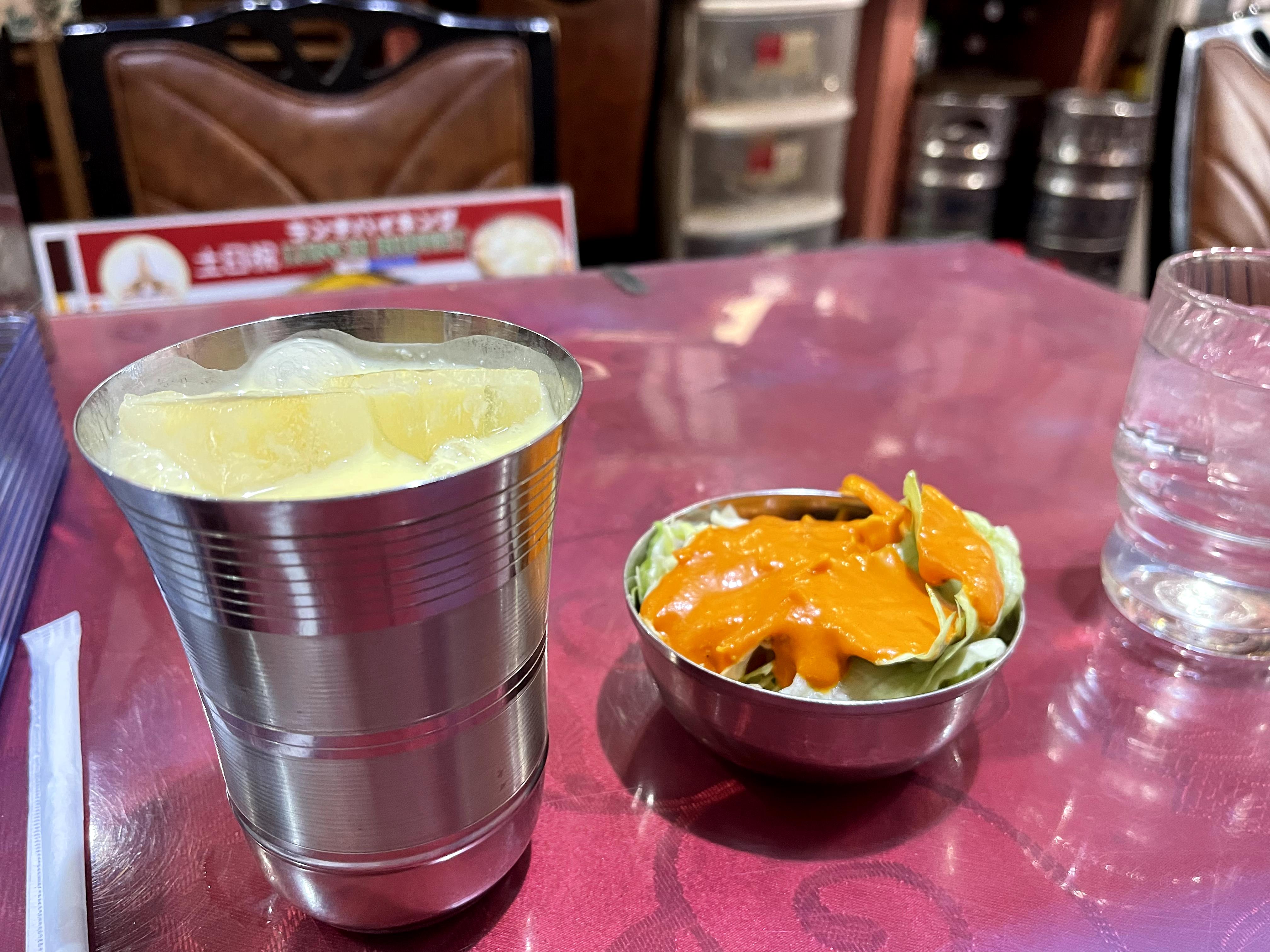 マンゴーラッシーとサラダ。